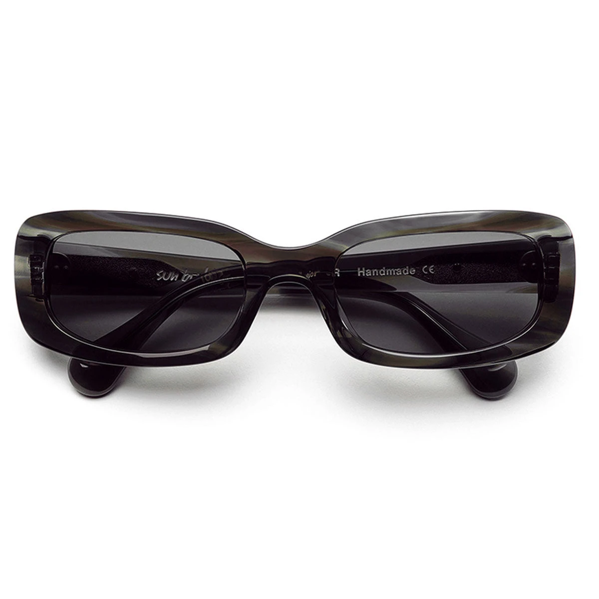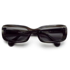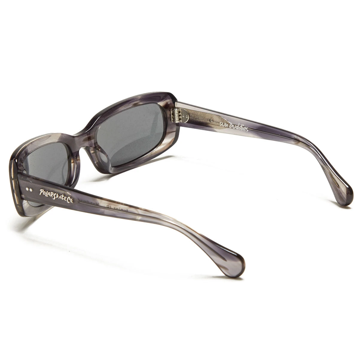 Square shaped frame in a watery italian acetate in various shades of blue. Polar Skate Co. silver metal logo plaque at the arms. Blue Carl Zeiss lenses with 100% UV protection and a seven bar hinge with visible rivets on the temple. Comes in a luxurious faux leather hard case and paper box. Cleaning cloth included.