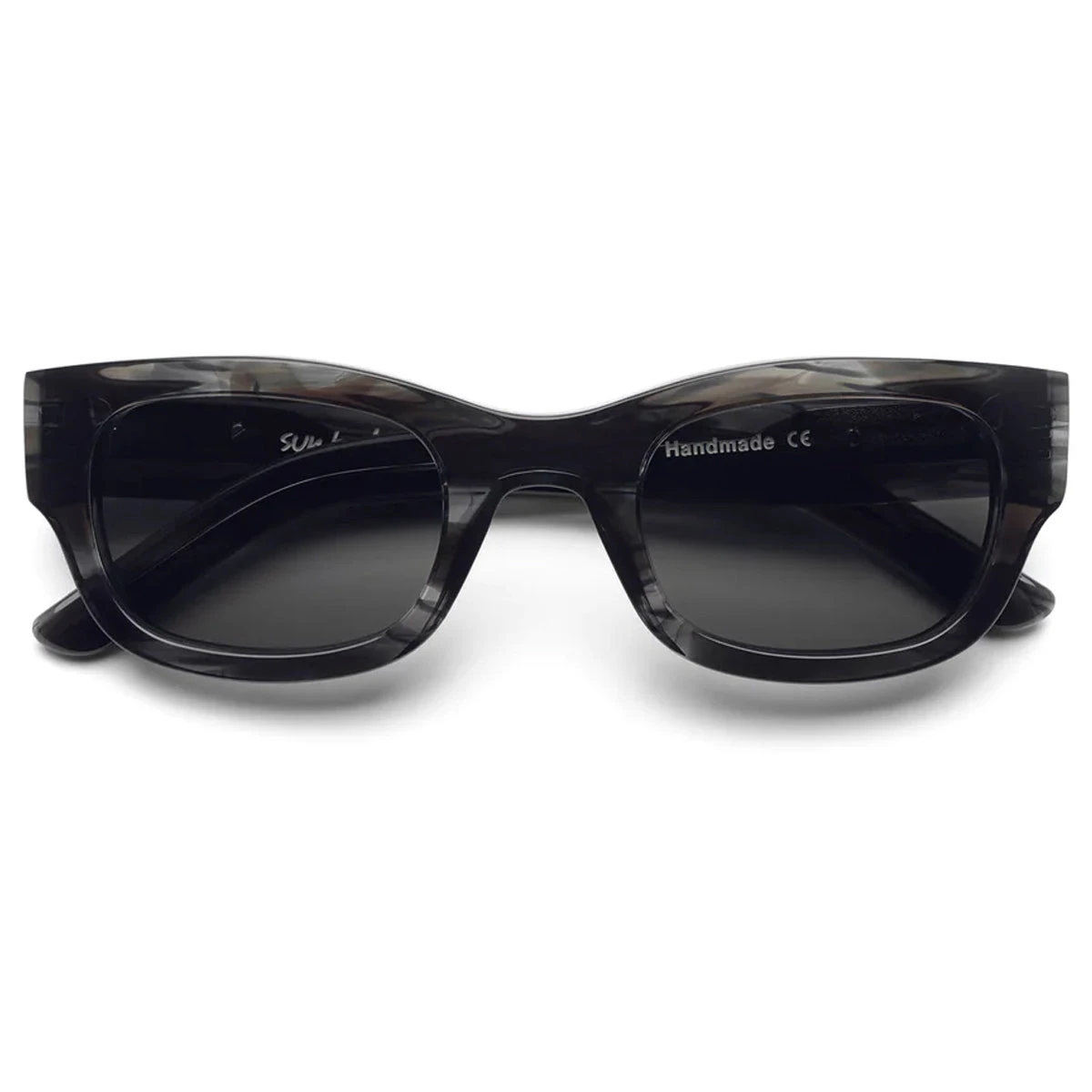 Sporty slightly thicker frame in smoky black, handmade of italian acetate. Polar Skate Co. silver metal logo plaque at the arms. Black Carl Zeiss lenses with 100% UV protection and a seven bar hinge with visible rivets on the temple. Comes in a luxurious faux leather hard case and paper box. Cleaning cloth included.